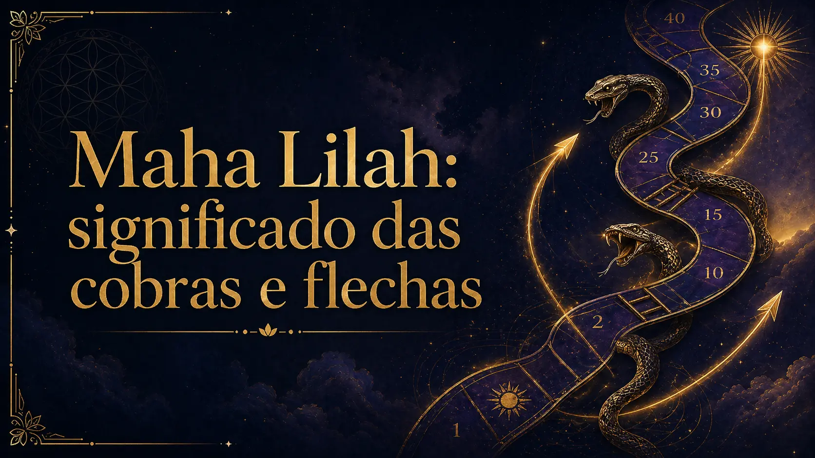No Maha Lilah, cobras e flechas representam movimentos de consciencia. As flechas indicam subidas, alinhamentos ou saltos de percepcao. As cobras indicam quedas, retornos, apegos ou pontos que pedem revisao. Elas nao sao premio ou castigo: sao sinais simbolicos para ler o momento com mais honestidade.